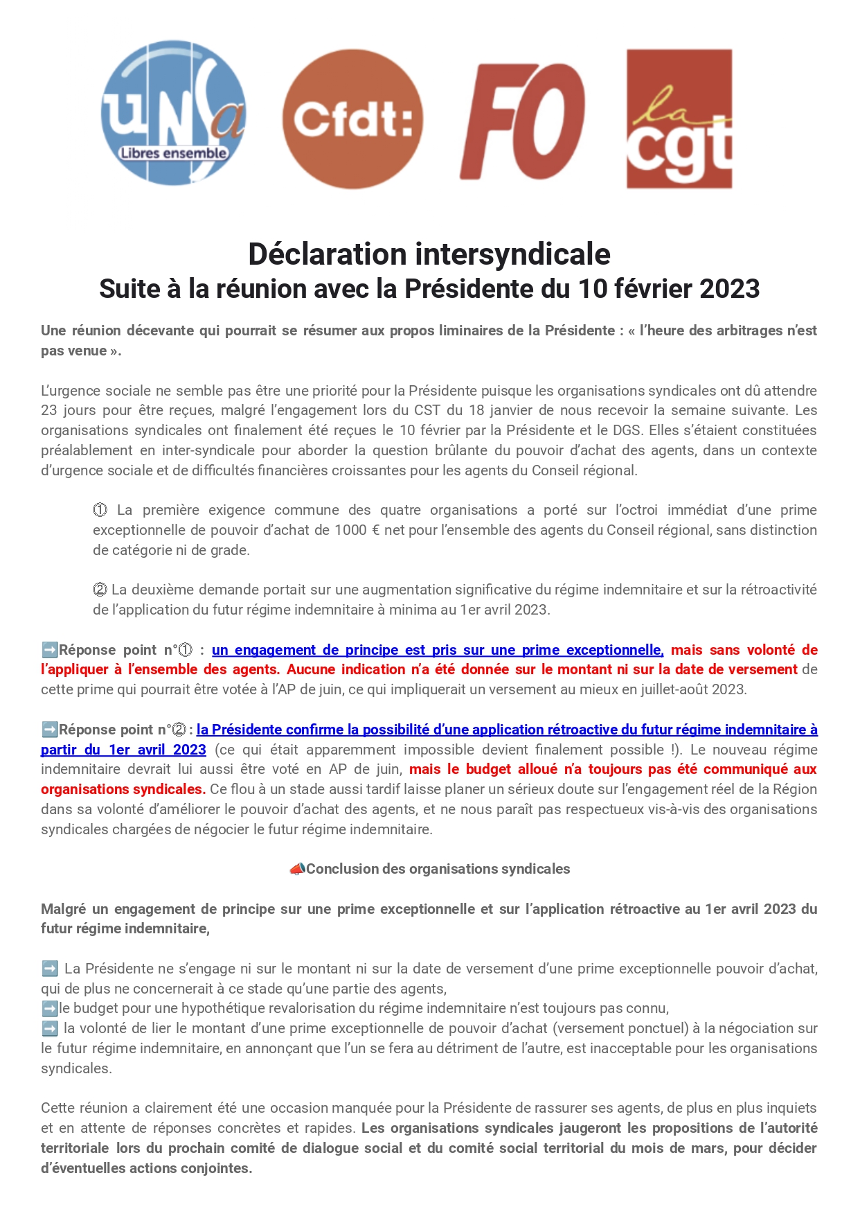 Déclaration intersyndicale suite à la réunion avec la présidente le 10 février 2023